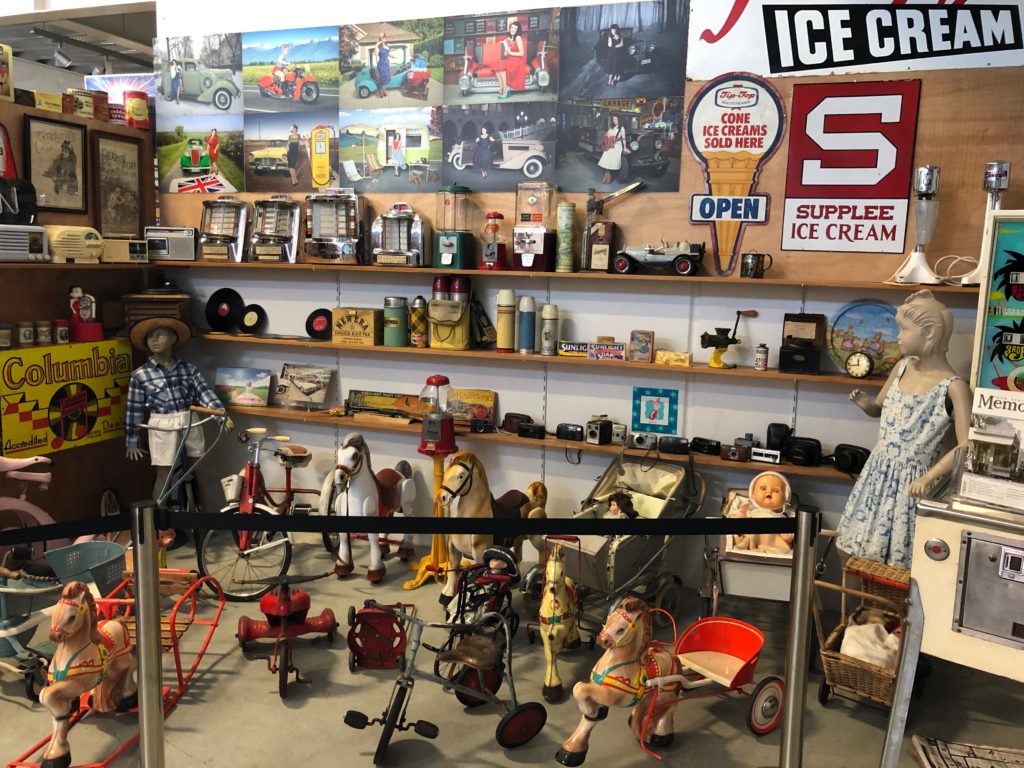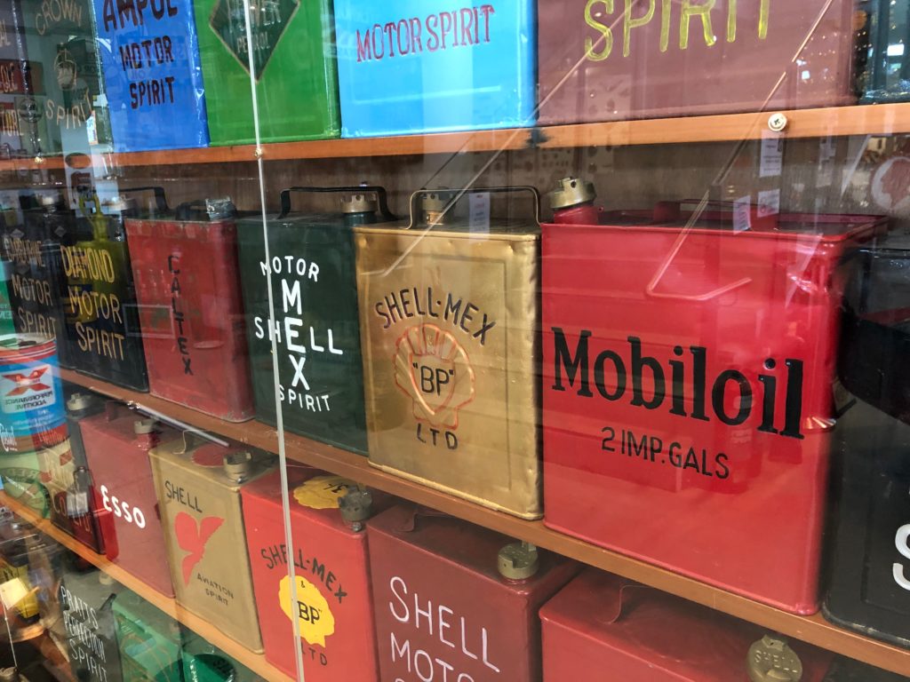 館内には車だけでは無く、看板やオイル缶など、車にまつわる品々やその時代のプロダクトが飾られていました。