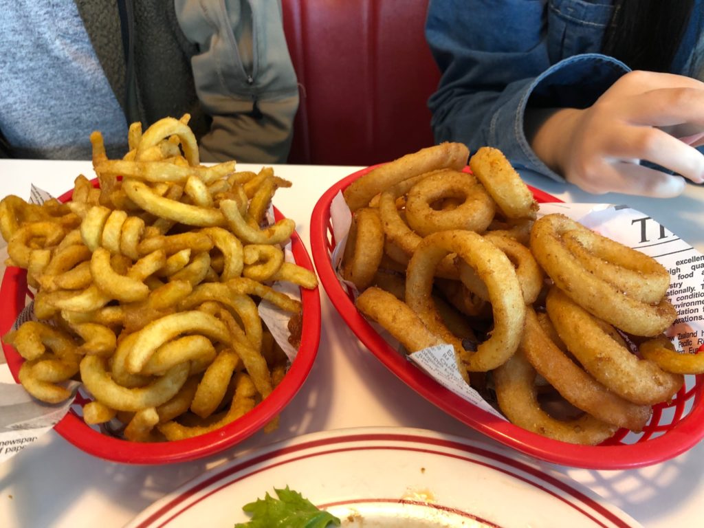今回は私たちはショーケースの中のパイとポテトフライ、そしてオニオンリングにしました。