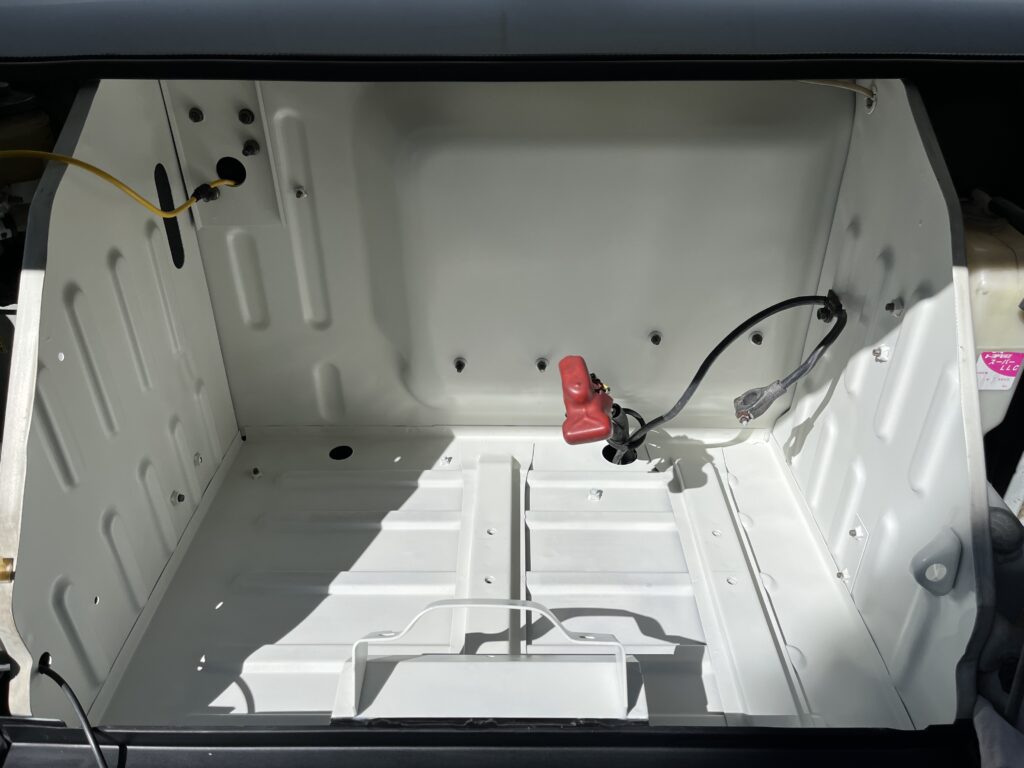 この車にはボンネットにメインバッテリー(走行用バッテリー)が置かれただけのトランクスペースがありますので、こちらにサブバッテリー(エンジン停止時に室内で使う電気用のバッテリー)とAC-DC充電器(家庭やキャンプ場のコンセントから電気を充電する機器)を設置します。