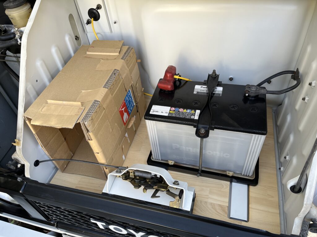サブバッテリーの位置決めも段ボールでダミーバッテリーを作り、ボンネットを閉めた時に機器との干渉が無いかを確認しています。サブバッテリーは重量が25kgありますので、実物を何度も上げ下ろしするのを避けたい思いもありました。