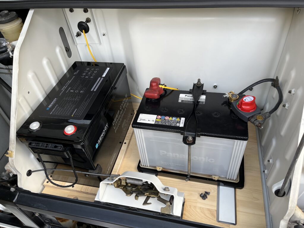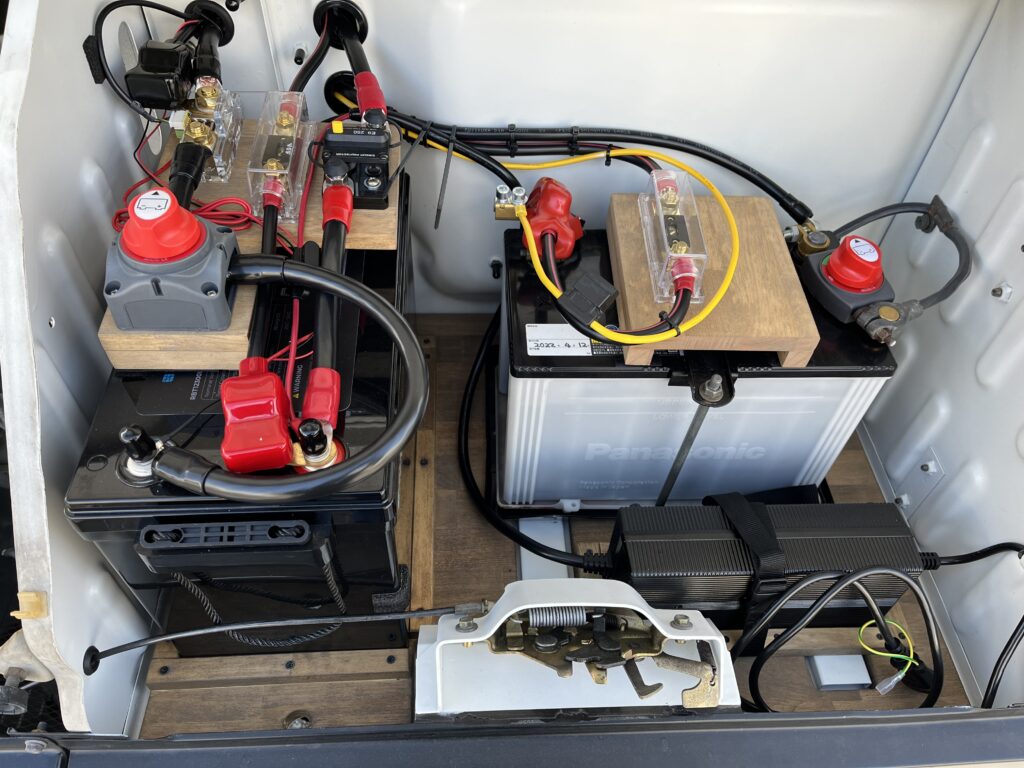 バッテリーの容量に関して、私の場合はサブバッテリー本体を置く場所はボンネットの中と決めていましたので、ここに入る最大限の容量(今回は300ah)を選択しました。