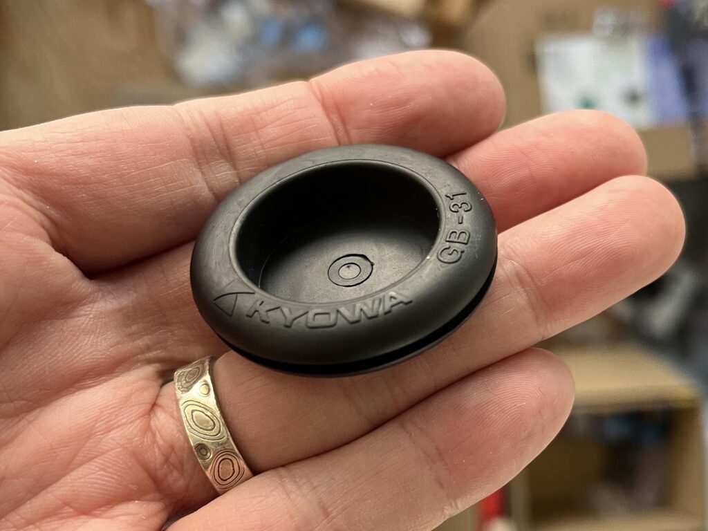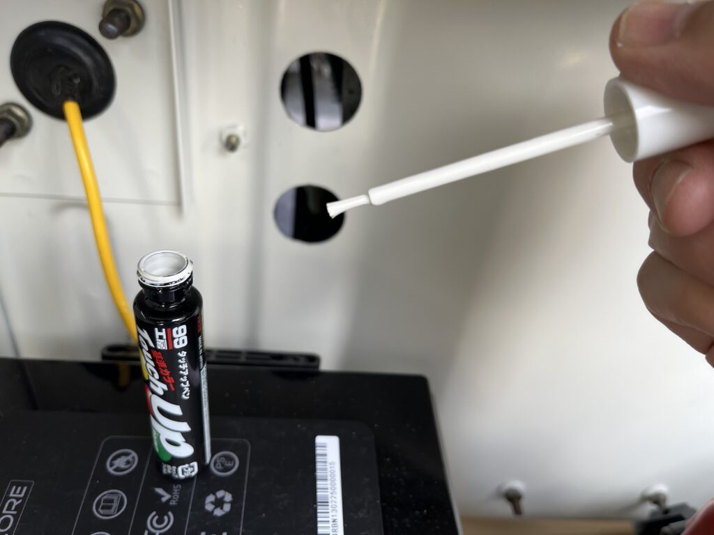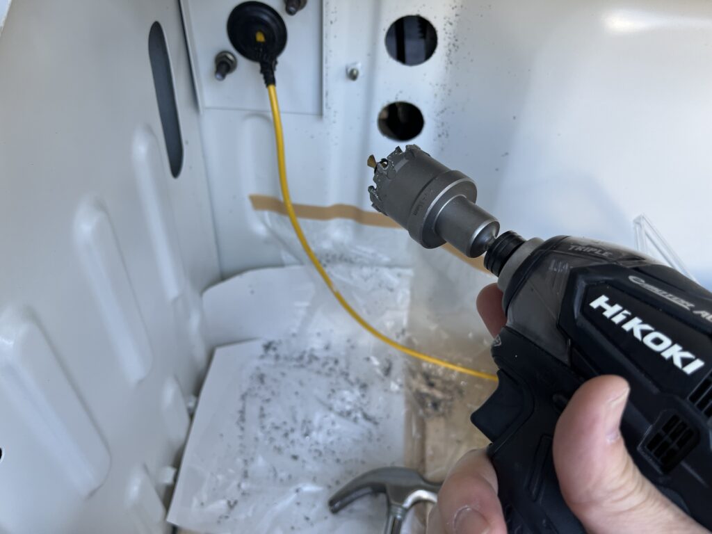 車内に引き込むケーブルのための穴を2カ所追加で開けました。穴を開けた後はヤスリでバリを取り、タッチアップペンで塗装してサビ予防をしています。その後ゴムブッシングを取り付けました。