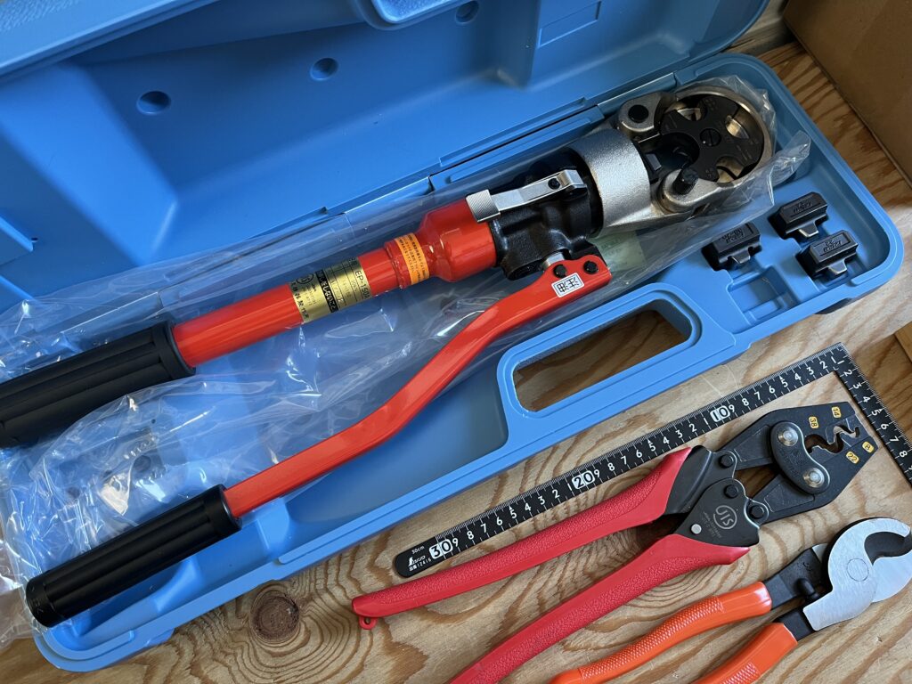 左)60SQのケーブルと裸端子の接続に必要な油圧式圧着工具を購入しました。