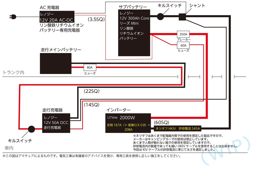 サブバッテリーシステムを車に施工する手順や技術的な情報はYouTube動画やWeb上にたくさんありますのでそちらを参考にしていただければと思います。