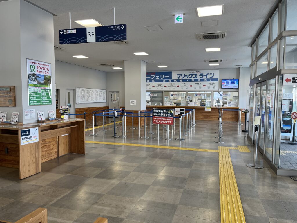 3階に上がるとこのように受付窓口が見えますので手前の柱のカウンターで自動車航送申込書を記入して窓口に持って行きます。