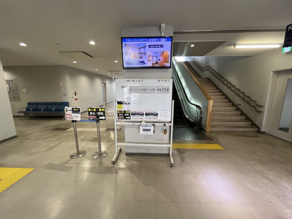 窓口の女性に予約と支払いの確認、そして車検証に記載されている車体サイズを確認してもらうと車両に貼り付ける目印と乗船券が渡されます。